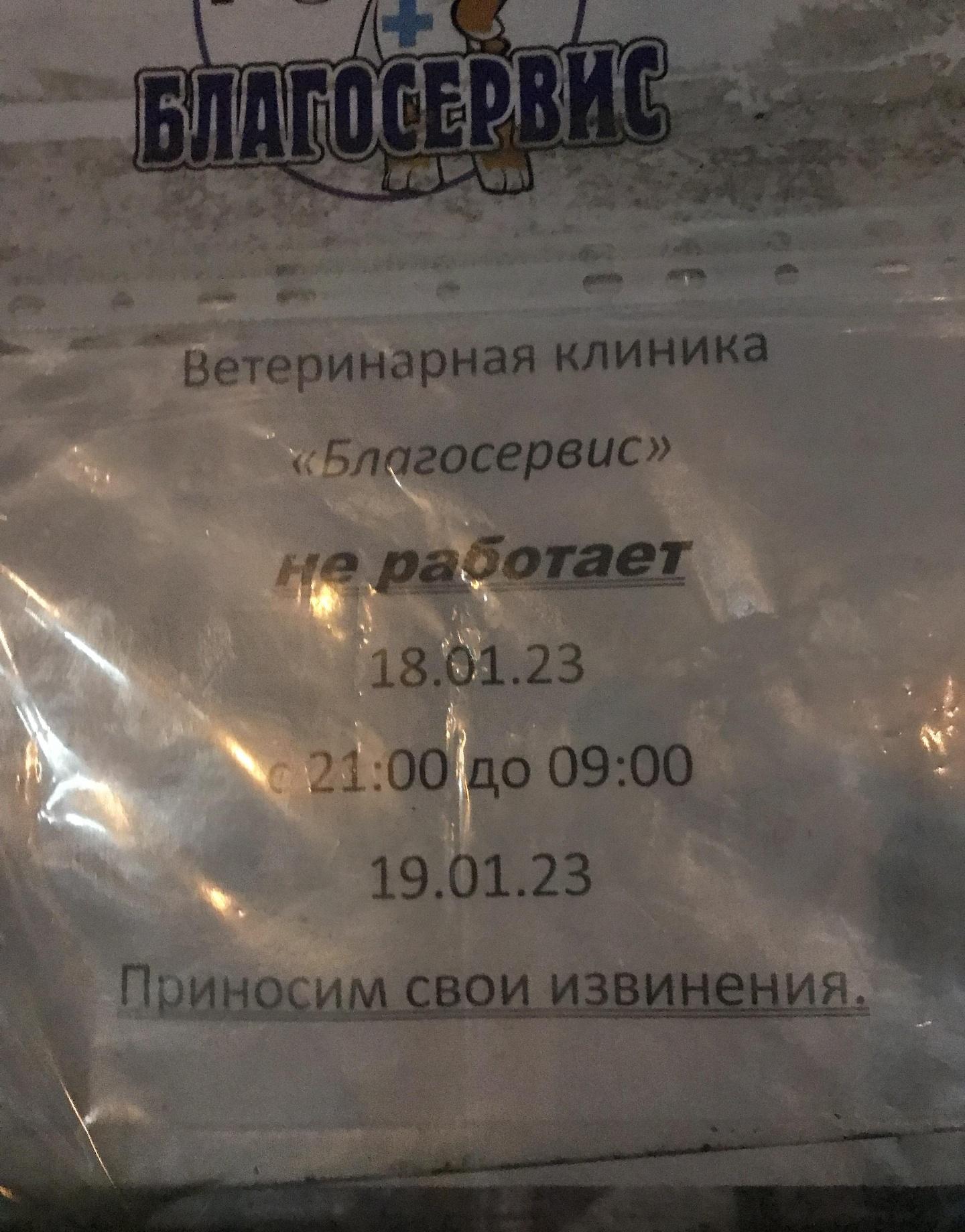 В приложении 2гис не было указано что именно сегодня ночью клиника не работает, приехали издалека и стояли пол часа в мороз и ветер, полуодетые, с умирающим в судорогах котом на руках. По дороге в другую клинику у него остановилось сердце.